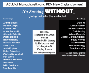 Some months ago I was part of an extraordinary evening at the Boston Public Library, sponsored by PEN New England, at which writers and actors read works by writers who had been denied entry into the United States. The purpose of the evening was to point out what beauty and power is lost when the voices of those deemed “undesirable” by our government are silenced. I had the great honor of reading three poems by the great Turkish poet Nazim Hikmet. Hikmet spent more than half his adult years as a prisoner, in and out of prison solely by virtue of the vicissitudes of Turkish politics. A good resource on Hikmet is: