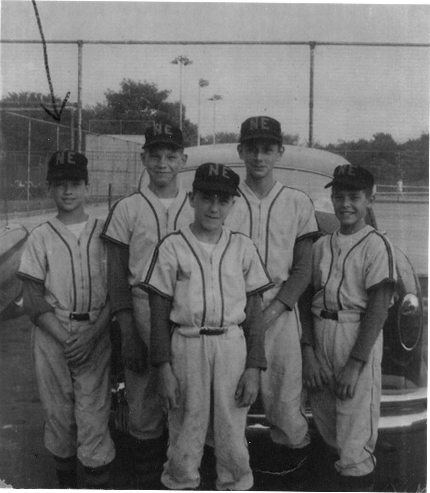 I am one of five boys in the picture. There is a ballpoint arrow coming down from the sky, from outside the frame of the photo, and it points to me. I don’t remember the names of two of the other four boys. We’re all in baseball uniforms. Although the photograph is black and white, I remember that our caps were black with orange letters — NE for North End — and that the trim on our uniforms was a thin black and orange brocade. I don’t remember this particular day although I know the spot where the photo was taken, just behind the handball courts at Jordan Park in Allentown, Pennsylvania. It is 1960 or 1961.