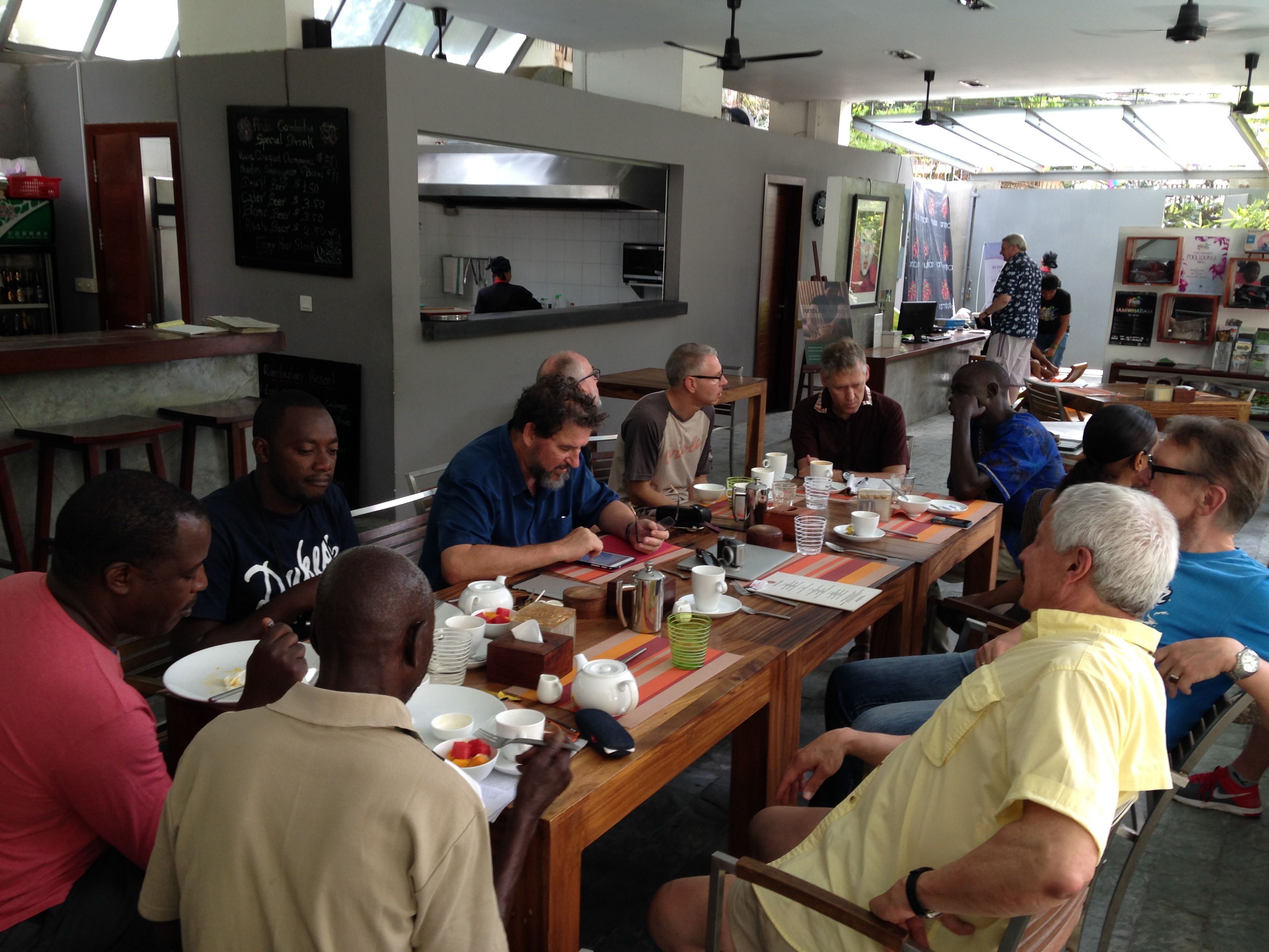 Here in Phnom Penh, the weather is hot and humid. Everyone is waiting for the rainy season to begin. The Institute delegates have been arriving: from USA, UK, Australia, Uganda, New Zealand, Japan, Norway, Serbia, Albania, Thailand, Vietnam, Cambodia, Afghanistan, China, Philippines, Nepal. Here’s a photo of some of us at breakfast this morning: