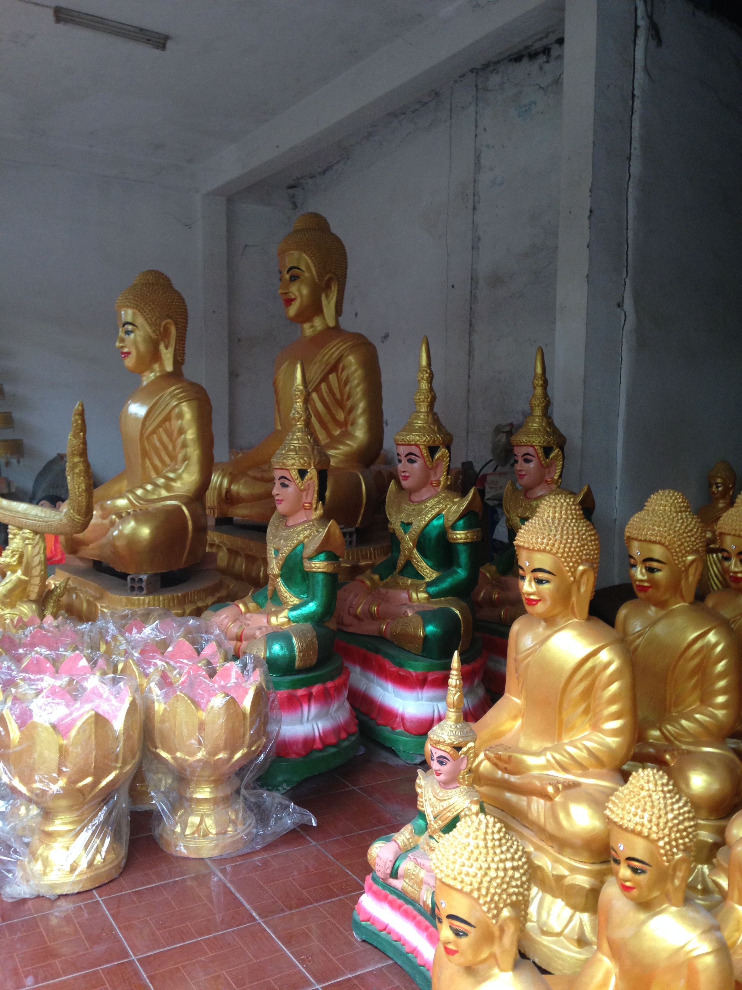 Phnom Penh is glorious: hot, stinky, humid, dynamic, loud, colorful, intense. On my walk today I found a little Buddha factory up a smoky alley that wound back into a neighborhood of people: